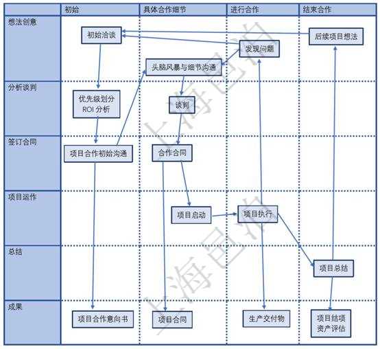 项目执行完毕后,通过项目总结提交项目结项资产评估报告并产生后续项目想法,后续项目想法由新的初始洽谈和优先级划分与ROI分析启动。